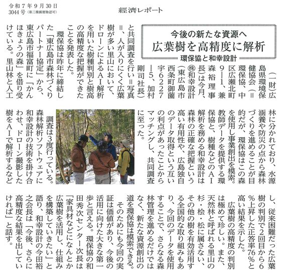 經濟レポートにドローン事業が掲載されました🌳 ~今後の新たな資源へ 広葉樹を高精度に解析 環保協と和幸設計~