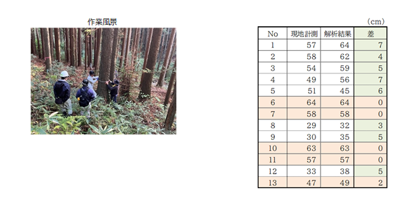 また、現地での胸高直径測定13本のうち、AI解析値との誤差は最大7cmで、5本については2cm以下と高い一致が得られました。